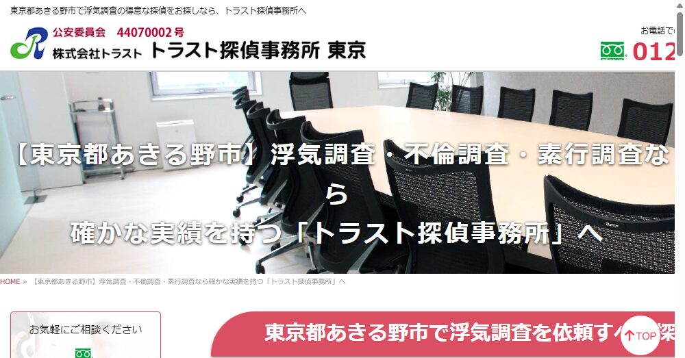 トラスト探偵事務所は東京都あきる野市に拠点を置き、浮気調査・不倫調査・素行調査を専門としている信頼の高い探偵事務所です。