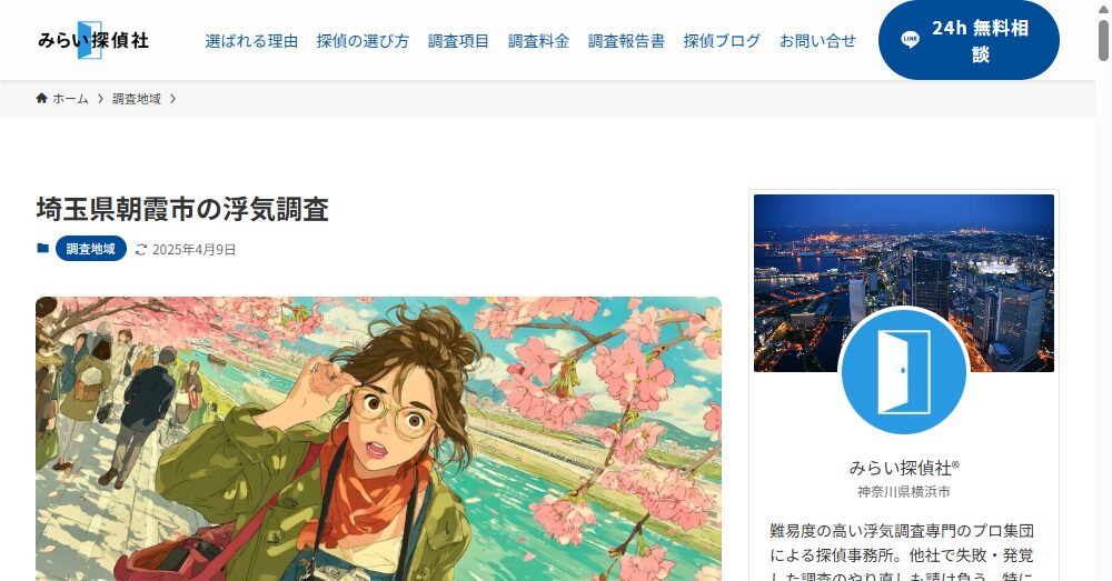 - 埼玉県朝霞市を拠点に、調査業界トップのスペシャリスト集団による浮気調査を提供し、他社が困難とする高難度案件にも対応。