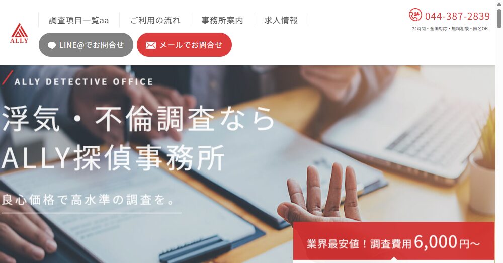 ALLY探偵事務所は浮気や不倫調査に特化した、専門機関で業界最安値の調査料金を実現しています。
