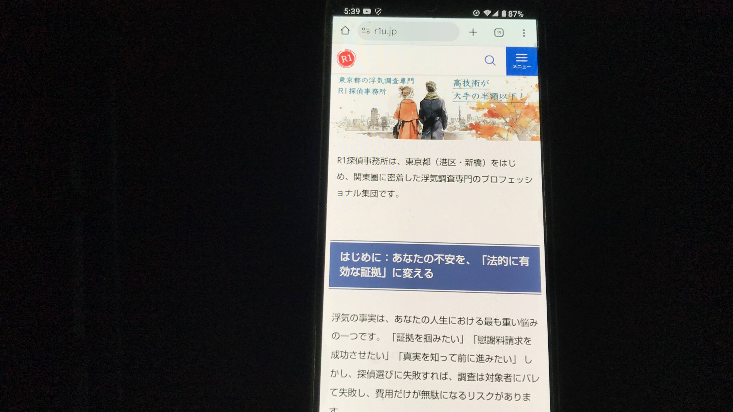 - 1997年の設立以来、関東圏で活動するR1探偵事務所は、34年の経験をもつ探偵が高品質でリーズナブルな不倫・浮気調査を提供。