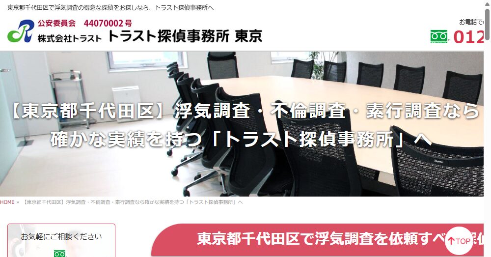 - 東京都千代田区で20年以上の経験を持ち、確かな実績を上げているトラスト探偵事務所は、特に浮気調査に特化した専門家集団です。