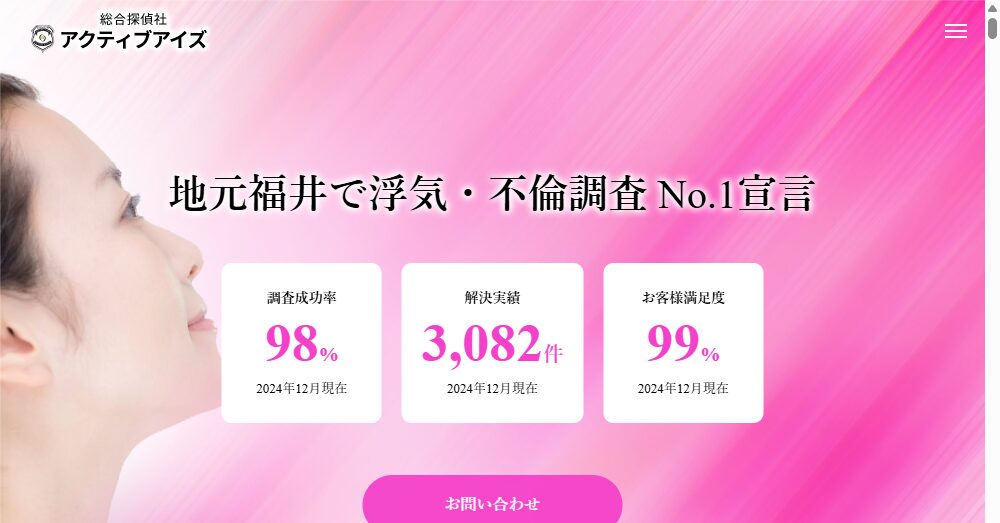 総合探偵社アクティブアイズは、福井県に特化し、浮気調査をはじめとする幅広い調査サービスを提供しています。