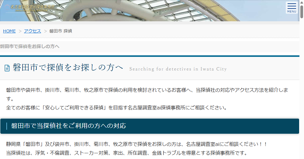 名古屋調査室ai探偵事務所は静岡県磐田市を中心に幅広い調査業務を提供する探偵事務所です。