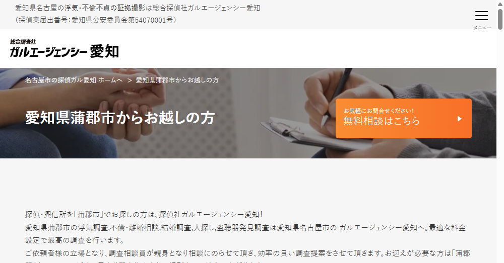 - 法務事務所を併設し、高い調査力と解決力を持つ総合探偵社フリースタイルは、蒲郡市での調査において交通費が無料で、低価格かつ高品質なサービスを提供しています。