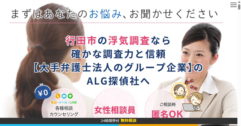 ALG探偵社は行田市に拠点を置く浮気調査専門の探偵社であり、大手弁護士法人のグループ企業として、法的な視点から信頼性の高い調査サービスを提供しています。