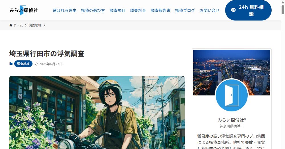 - 埼玉県行田市に根ざした調査力!特に浮気調査においては、地域のラブホテル街を熟知し、証拠を確実に押さえるノウハウを持っています。