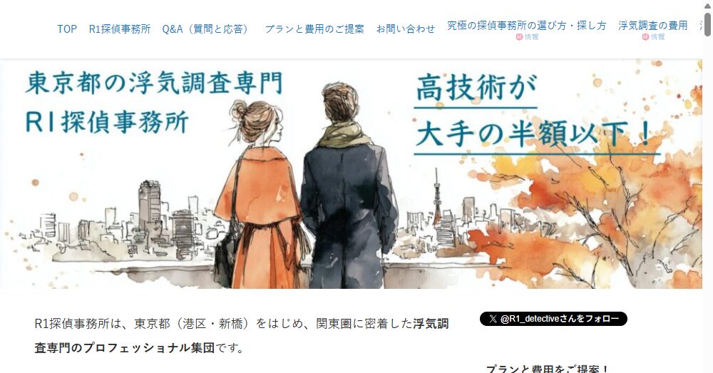R1探偵事務所は東京都(港区・新橋)を拠点に浮気調査に特化し、設立から28年の豊富な経験を誇る専門集団です。