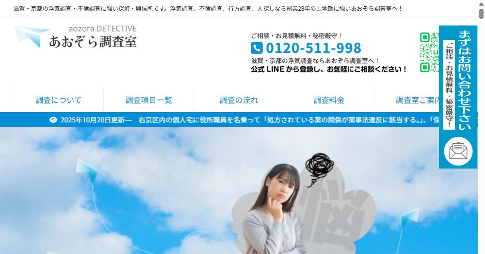 あおぞら調査室は滋賀・京都に展開する信頼の高い探偵社です。創業以来28年の経験を持ち、特に浮気調査や不倫調査に特化しています。