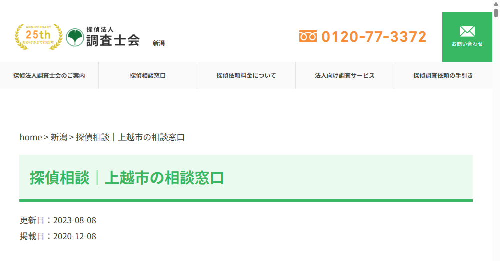 - 地域密着型の探偵法人新潟調査士会は、上越市専用の相談窓口を提供し、経験豊富な相談員が24時間無休でお客様の悩みを解決します。
