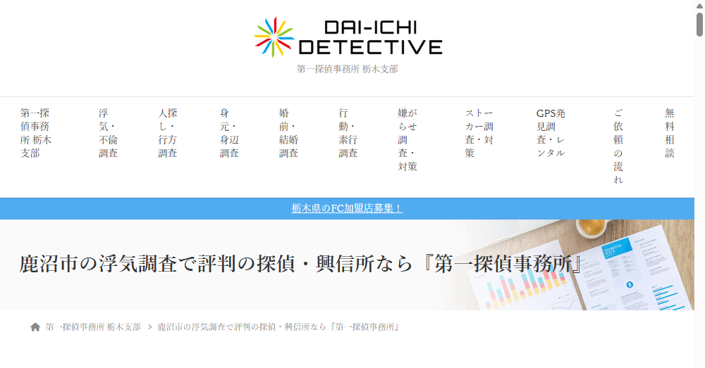 第一探偵事務所は鹿沼市に位置する浮気調査で評判の探偵事務所で、全国展開する第一探偵グループの一員です。