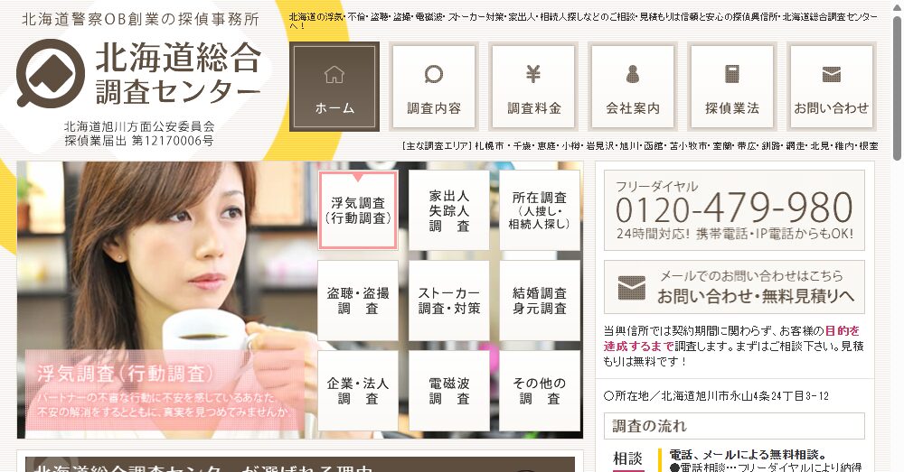 - 北海道警察のOBが創業した信頼の探偵事務所で、浮気調査から人捜しまで幅広い調査を専門としています。
