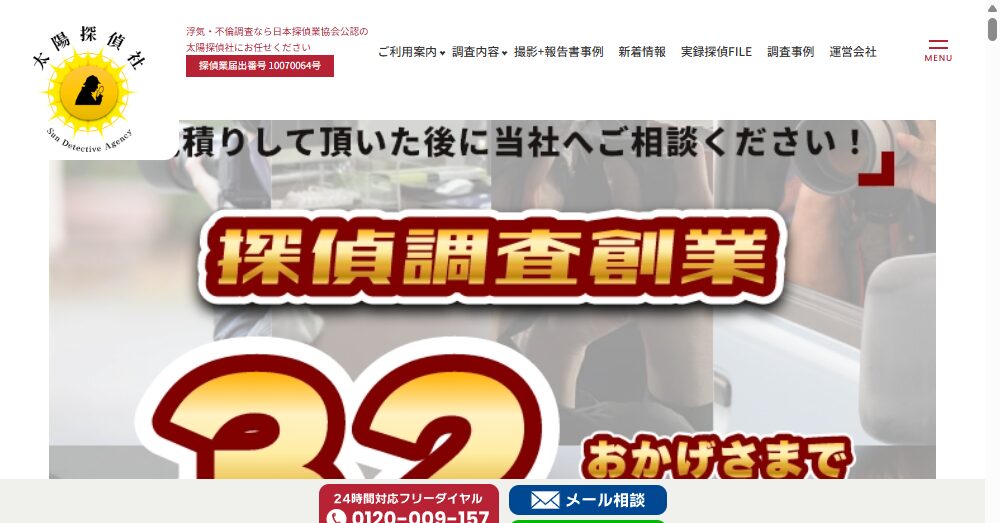 | 調査項目 | 浮気調査(行動調査)、家出人・失踪人調査、所在調査(人探し)、盗聴器発見・盗撮器発見電磁波調査・GPS器材発見、ストーカー調査・対策、結婚調査・身上調査、企業信用・法人調査、その他の調査 |