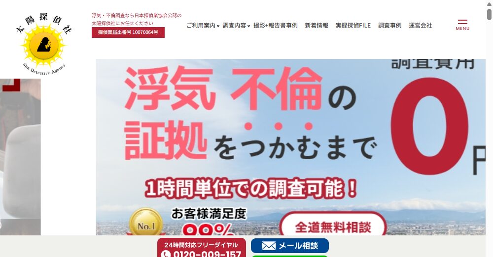 - 太陽探偵社は「結果を出すまで調査費用0円」を掲げ、顧客の安心感を最優先にした独自のサービスを提供しています。