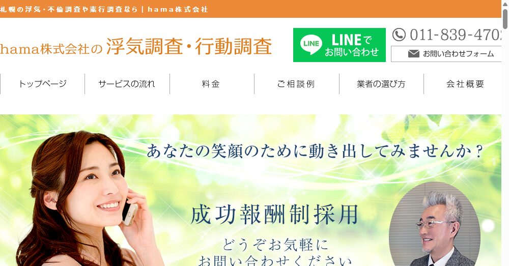 hama株式会社は北海道札幌市に位置する浮気、不倫、素行調査専門の探偵事務所であり、設立から18年間に渡り多くの顧客から信頼を得ています。