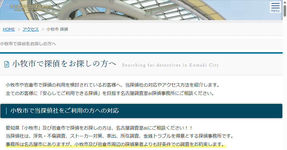 | 公式サイト | https://www.tantei-110.com/area/komaki/ |