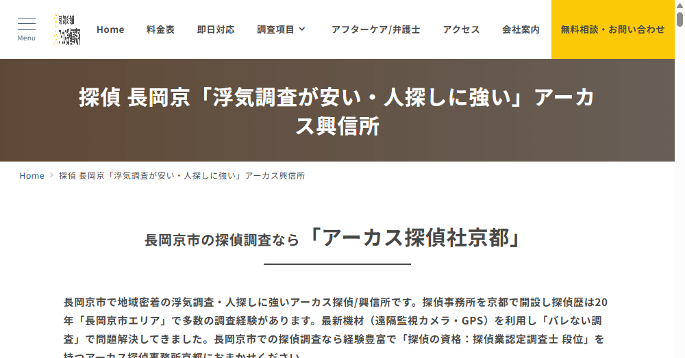 アーカス探偵/興信所は長岡京市に位置する調査サービスの専門家であり浮気調査や人探しに特化しています。
