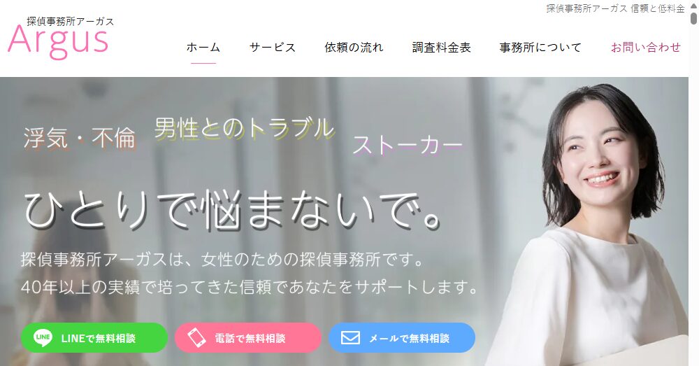 探偵事務所アーガスは創業から40年以上、低料金で浮気調査や素行調査などを提供する信頼される探偵事務所です。