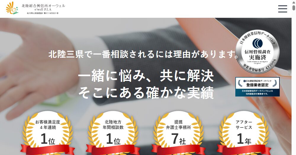 - 北陸地方で4年連続お客様満足度1位の北陸総合興信所オーウェル。地域密着型のプロフェッショナルが、浮気・不倫調査や婚前調査を安心価格で提供します。