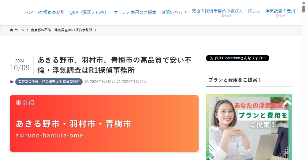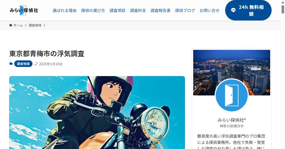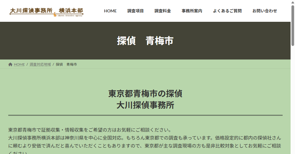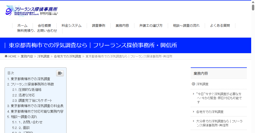 | 公式サイト | https://freelance-tantei.com/業務内容/浮気調査/各地域での浮気調査/東京都青梅市での浮気調査なら|フリーランス探/ |
