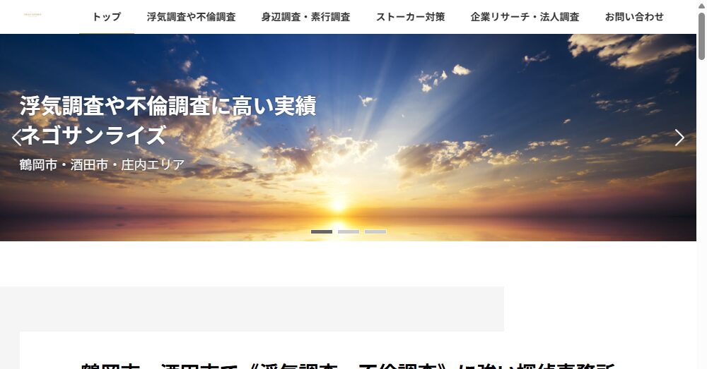 - 鶴岡市・酒田市で30年の実績を持つネゴサンライズは、浮気調査・不倫調査に特化した地域密着型の探偵事務所です。