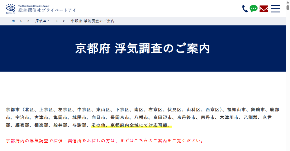 総合探偵社プライベートアイは京都府全域で浮気調査および各種調査サービスを24時間365日提供しています。